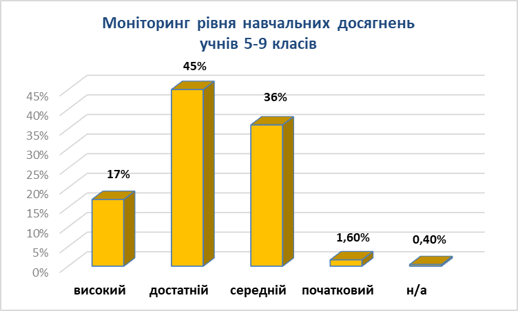 | Рік | Всього учнів школи 5-11кл. | Висо- кий рівень | % | Достат-ній рівень | % | Серед- ній рівень | % | Почат-ковий рівень | % | Н/а | % |