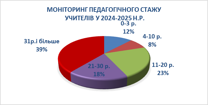 При розподілі педагогічного навантаження адміністрація школи враховувала кваліфікацію вчителів, результативність їх роботи в попередні роки, рекомендації профспілкового комітету з метою соціального захисту учасників навчально-виховного процесу, віковий склад педагогів та досвід їх роботи, результати опитування батьків та учнів. У 2024-2025 навчальному році школа була повністю укомплектована педагогічними кадрами.